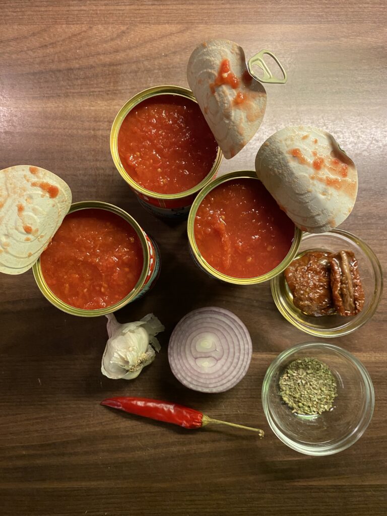 Finn frem ingrediensene, men husk: Dette er en litt omtrentlig oppskrift, som du kan variere etter hva du har. Du ha noen biter løk og noen bokser med tomater. Du kan ha i oregano, hvitløk, chili, soltørkede tomater og rødvinseddik.