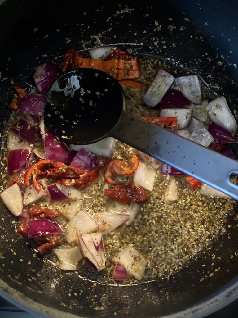 Fres løken og eventuelt de andre ingrediensene myk og blank i olje.